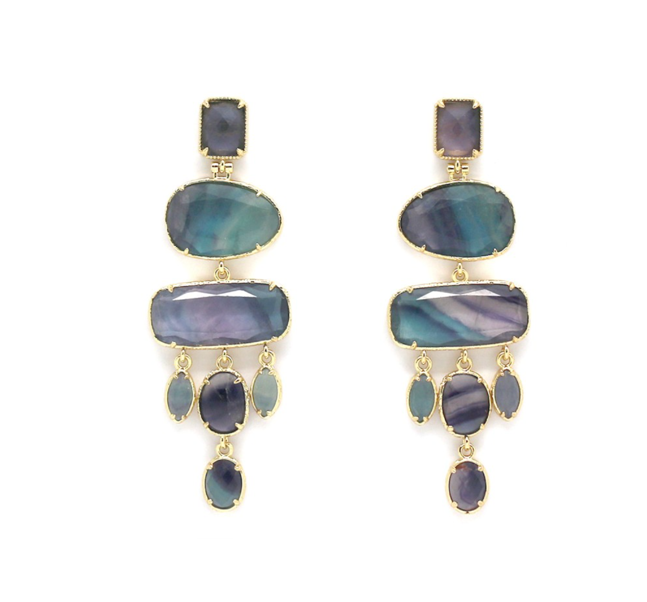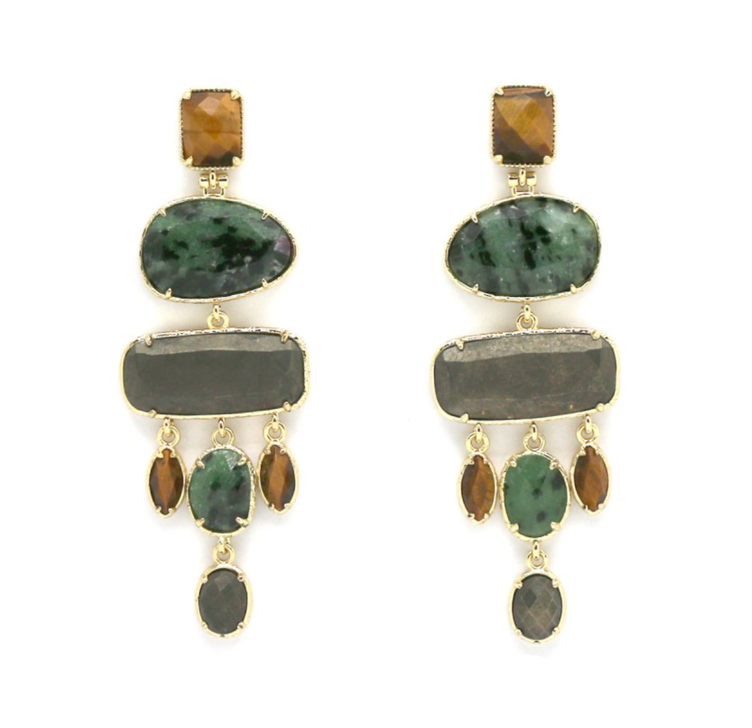 Šie auskari ir izgatavoti no augstvērtīgs zeltītas bronzas un dabīgajiem akmeņiem, kas piešķir katram pārim savu neatkārtojamo šarmu. Katrs akmens ir unikāls, tādēļ auskariem var būt nelielas atšķirības krāsās un faktūrās.